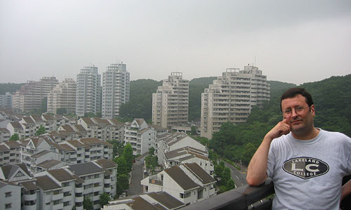 Hiromi and I climbed the local observation tower atop a nearby hill for a view yesterday; that’s me, with my apartment complex in the background.
