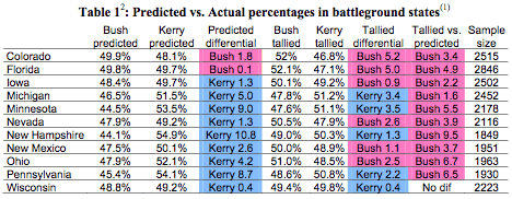 Via Kevin Drum, more evidence that the election was rigged, this time in the form of an academic paper by Steven Freeman (PDF file) on the subject, doing a statistical analysis of the exit poll numbers versus the actual tallies. Take a look at this chart showing what the exit polls predicted, what the actual counts were, and–most significantly–what the difference was between exit polls and the reported counts: