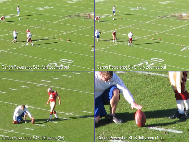 The two key images are the ones at the bottom, which show the difference you get between the 3x zoom and the 10x zoom. These images were shot from the upper deck at Candlestick Park during the pre-game activities. I figure that the 25-yard-line, where the kicker was practicing, was about 60 yards distant from the lens. So looking at the lower-right image of the ball at the kicker’s feet, that’s a pretty good zoom image. I mean, I’m getting blades of grass and you can almost read the writing on the football.
