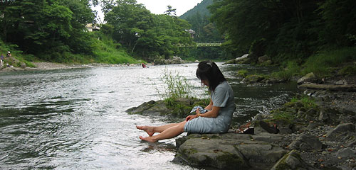 Hiromi rests her tired feet in the Tama River.