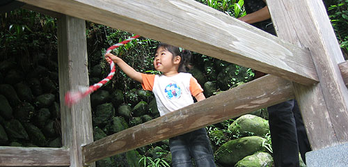 A little girl has a crack at the temple bell that visitors ring all day.
