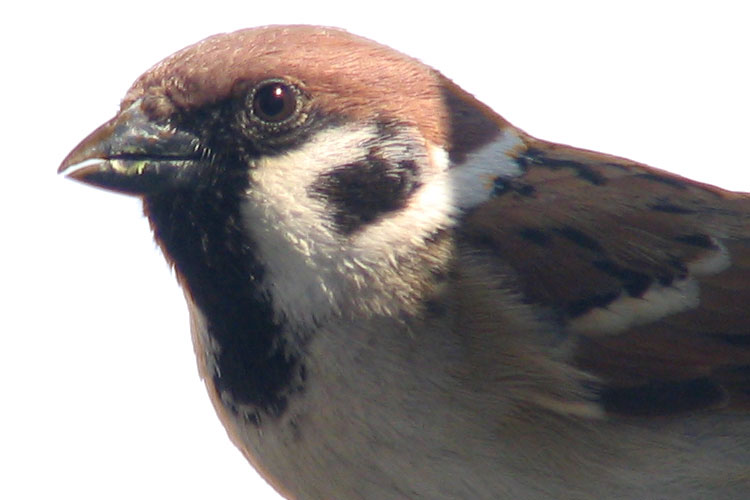 Despite my window areas lacking any kind of hook, latch or other place to attach a feeder, I’ve rigged a bird feeder onto the satellite antenna brace in an attempt to bring some of the local wildlife to my window. The tree sparrows found it the other day and have been feeding fairly frequently–but certainly not all the time. And they tend to be skittish, flying off if I move even a little anywhere in sight. But if I’m patient and sit by the window for long enough, they won’t notice me if I’m still. So I set up the camera on a tripod, and have been using the full 16x zoom on them from a distance of only a bit more than two meters away. Despite the very windy weather today, they’ve still been coming, and I’ve gotten a few nice shots. This one I thought was particularly good: