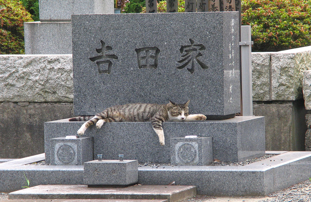 The first cat was taking a nice, sprawling nap right smack atop a family grave marker. Cats don’t much mind where they are when it comes to resting. I’m not sure if the Yoshida family would mind…