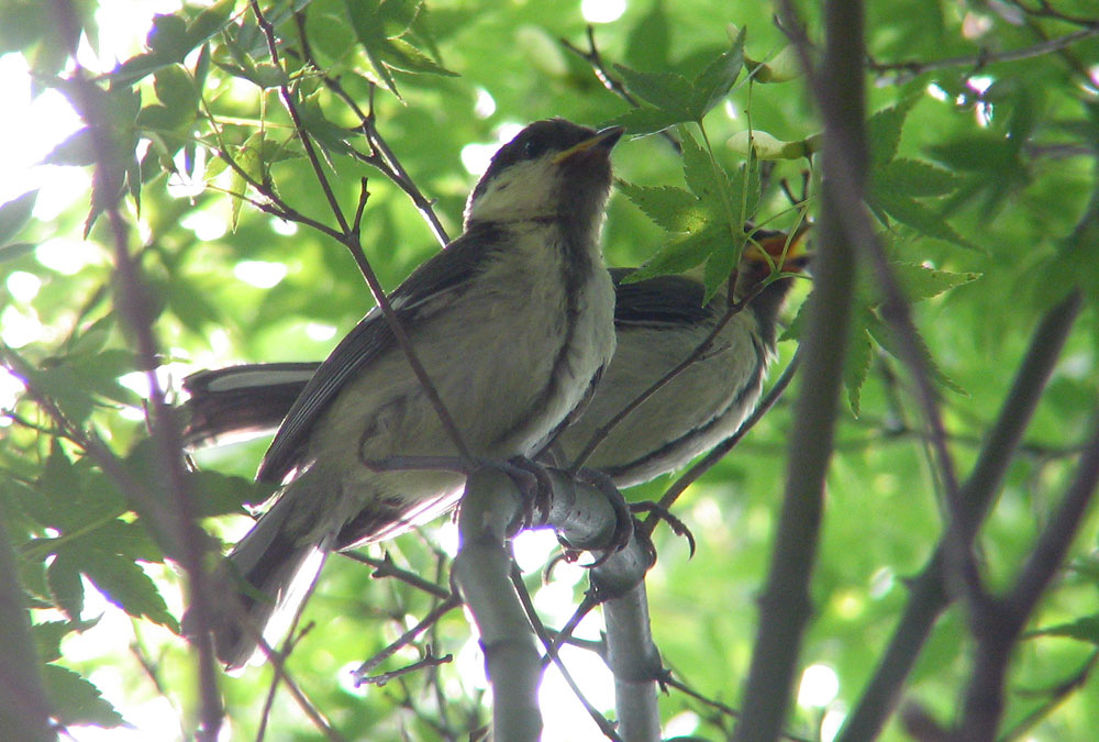 As for the birds, it looks like this is the time for the immature chicks to break out and follow the folks around. Here’s a pair of still-immature Greats in a tree off of the Tama River: