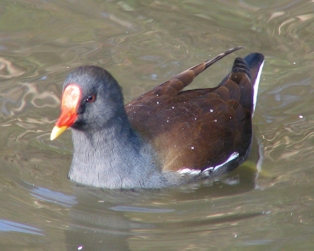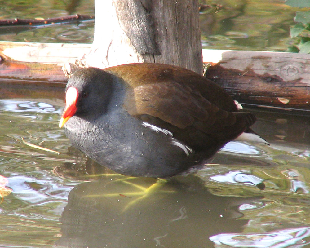 First, the Common Moorhen. You can spot these easily along the main bridge across the lake, the same bridge where you line up to rent the pedal-boats. The Moorhens are among the ducks taking food from passers-by along the bridge, on the side opposite the boats. The Moorhens tend to hang back. Before, I saw only an immature one; today, a family of three were out (all images today have enlargements when clicked):