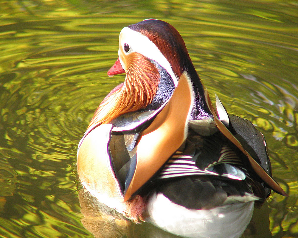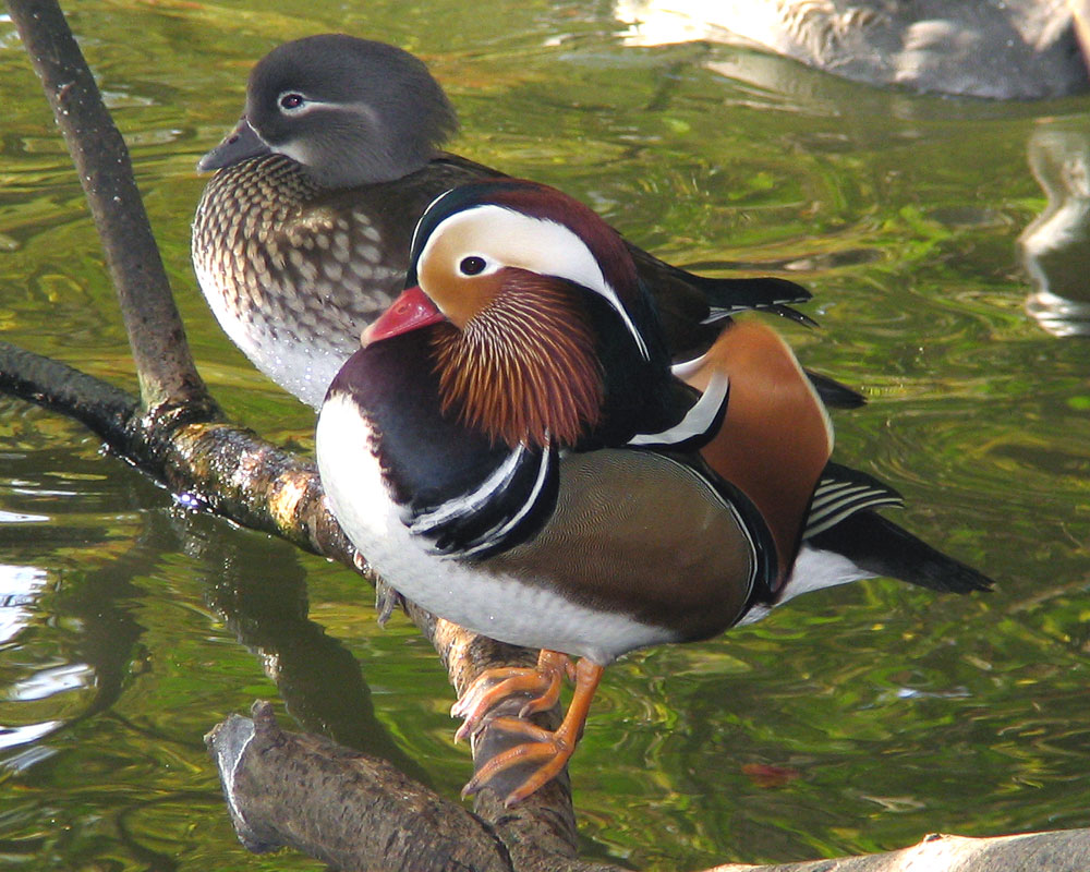 Yes, the Mandarins, like Wood or Harlequin Ducks, are rather beautifully and even outrageously colored. In particular, I am impressed by the brown flaps on the Mandarin’s back (probably most responsible for giving them their name, as they resemble tha outfits worn by Chinese Mandarins). The flaps are formed by the bird’s tertiary wing feathers, which seem to somehow join together to create what appears to be a seamless surface area.