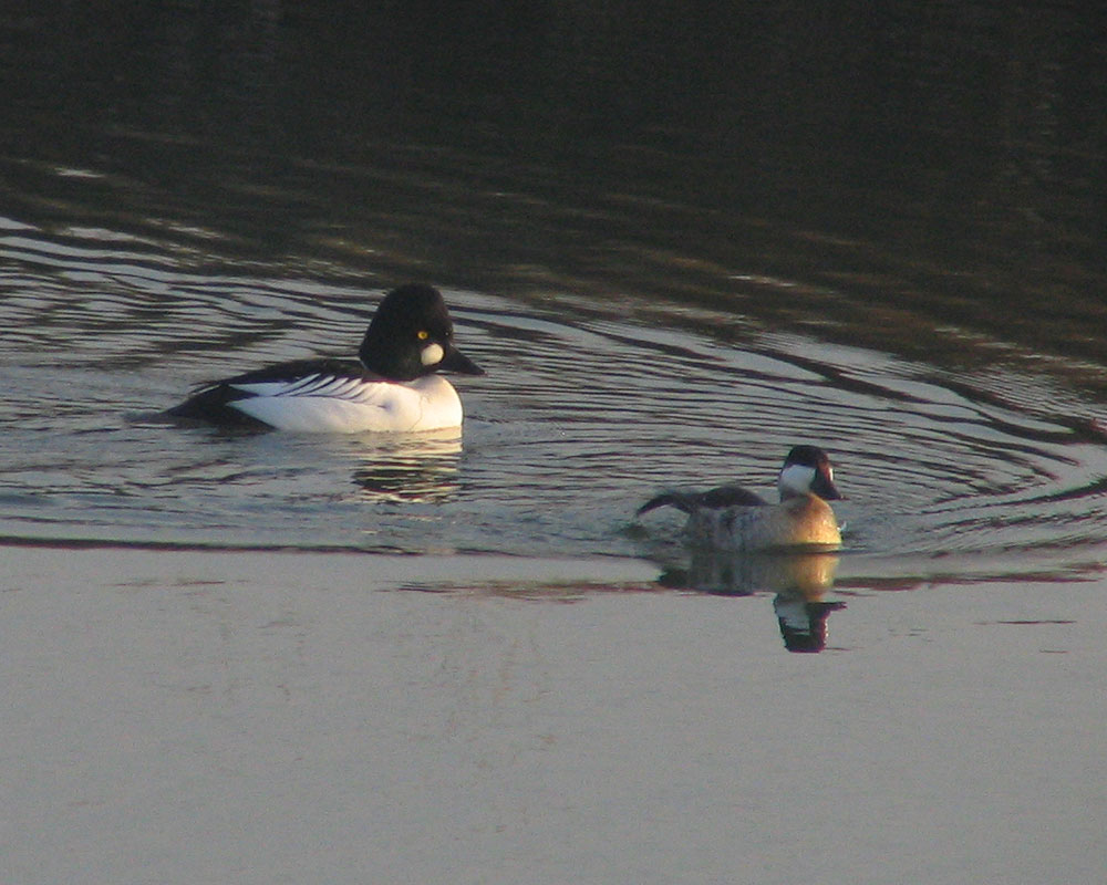 And similar to the Merganser, there was a Common Goldeneye, also a large-headed duck. In this shot, it’s close to what appears to be a Ruddy Duck (also expandable):