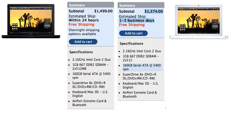 Go ahead, try it yourself. All you have to do is upgrade the white MacBook’s hard drive to match the black MacBook. Quite a hefty surcharge for a dead simple, purely ornamental difference.
