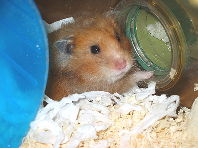 I find that I have been remiss in covering one of the themes of this site–Mocha, the hamster, pictured above in her nest. Now well past middle age (hamsters commonly live only a few years), Mocha is still going strong, running in her little wheel, enjoying her running-ball excursions about the apartment, and so on. Also responsible about food–she always has more than she needs, and never overeats–she has taken to stuffing whatever food she doesn’t immediately chow down on and stores it in her habitrail tubes. So much so that, when she travels through the tubes, she makes a very loud crunching and grating sound as she bulldozes past all the sunflower seeds, stale bread bits and other hamster food as she goes.