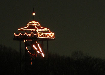 Just a little photo note here whilst I convalesce. I had forgotten that, every year around Christmas, the local hilltop observation tower (currently closed to the public) gets lit up quite nicely for the holidays. It stays that way a bit past the New Year, but I will have to see to be reminded for how long. It’s a lovely idea, and the only thing wrong with it is that they set the segments to flash on and off–it would be much better just to have them stay on, IMHO. Still, a nice gesture by the city (Hiromi opined that we must pay a lot in city taxes because of this, but frankly I don’t see this costing quite that much) and a nice though temporary addition to the skyline.