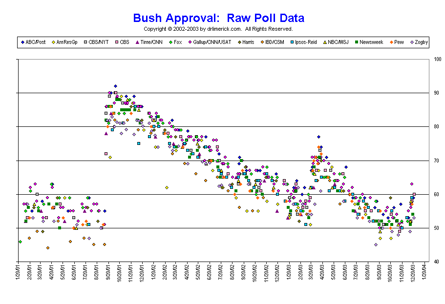 Someone at the web site Professor Pollkatz’s Pool of Polls (and Auto Supply, I suppose) has, despite the goofy name, done a great job of taking the polls tracking Bush’s approval and disapproval numbers over the past three years. Fourteen different polls were taken to make the chart. Earlier, I posted about Bush’s poll numbers and noted that they indicated a natural state of descent, checked only by special events of note. This new chart only confirms that fact. Aside from 9/11, the Iraq War, and the capture of Saddam Hussein, Bush’s numbers have fallen consistently; only those events have brought his numbers up over time.