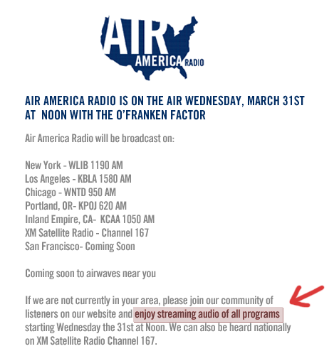 Air America Radio has changed their web site to an under-construction graphic (shown below) with radio frequencies to tune in on (sorry, dad, San Francisco is still not listed–but Fran, listen in at WLIB 1190 AM).