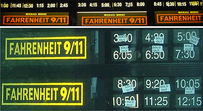 To see exactly how much so, just take a look at some of the photos on Moore’s site of the many screenings of the film across the United States–a few examples shown above, with F-9/11 showing every 45 minutes at one theater (top), and almost every show sold out at another theater (bottom).