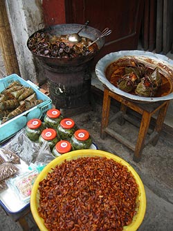 By this time, it was about 8:00 pm. On the way, we not only cruised by a lot of shops, but a ton of street vendors, selling, mainly, pirated DVDs and music CDs (a dollar apiece), jewelry, wallets, small pictures, and–for some reason–remote controls, like for your TV or VCR. A few strange stalls, like one run by a fellow who looked like he came from a Middle Eastern country, governing a huge mountain of nutcake of some sort–a salty mix of pieces of nuts in a gummy matrix, topped by candied walnuts, sweets, and dried fruit. A bizarre-looking concoction, probably popular somewhere in the world, but not quite our cup of tea.