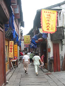 After lunch, we headed out for the historic site. The village itself, named Zhu Jia Jiao, is supposed to be about 300 years old, and consists of a network of canals (with Venetian-style gondolas and their rowers) and small streets laden with tiny shops where their keepers beckon you endlessly to take a look at their wares. A lot of special region-specific pork dishes and other foods for take-home were available, but there were a wide variety of other shops, many with items for sale at $1~$3, including items that appeared like jade and ivory but obviously had to be fakes. Any number of tourist trinkets were available, but we were able to avoid purchasing–even with hawkers as persistent as those we found.