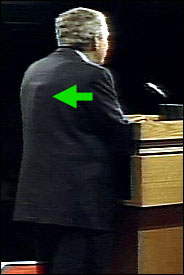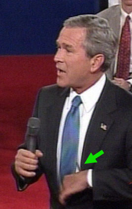 Additionally, during the second debate, it was noted that when Bush fidgeted with his jacket front and tie, what clearly appeared to be a wire hidden underneath became visible (second photo; for those of you who recorded it, it’s 28-1/2 minutes into the debate, near the end of Bush’s reply to the draft question).