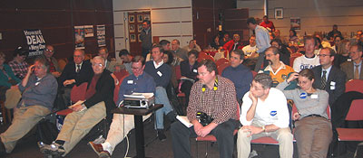 At the first count, it was Dean, Kerry, Kucinich, Edwards, Uncommitted, and Clark–so the Uncommitted, Clark, Edwards and Kucinich people, with the least votes, had to vote elsewhere or combine to make a larger group. This is where the “horse trading” started. A lot of the smaller-group people joined the uncommitteds, making them a viable group. The Dean group, from some reports (nothing official), had made a deal with the Kucinich people, to give them enough people to make the count in exchange for Kucinich people coming to Dean if Kucinich lost out–and that is what happened. After we lost a few people to time, the final count was: Dean 69, Kerry 51, and the Uncommitted group with 29. That’s the three delegates right there, the people going to Scotland.