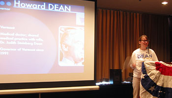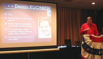 Wayne Parton speaks for Dennis Kucinich, although he was not the official representative–so he read from a script. Told the story of Kucinich, which was impressive enough. Youngest mayor of Cleveland, college instructor, and Congressman from Ohio, replacing the Republican incumbent. Also fought against the “Enron-like” takeover of Cleveland’s power system. He also spoke well on how Kucinich voted against the Patriot Act, against the war in Iraq–and spoke honestly about his chances, but pointed out rightly that Clinton was way down in January, and that getting to the convention and contributing to the party plank is important. This “unofficial” rep spoke on and on, but he said great things–and was eventually shouted off the podium for time.