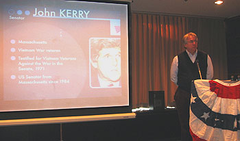 Mr. Skip Orr speaks for John Kerry; a lifelong Democrat, he nonetheless served in the Reagan administration, and tells that the Bush administration, particularly what he calls the “Bush cabal” are strong neo-conservatives, way farther right than Reagan and his people ever were. He spoke of a nightmare–January 2005 and Bush is at the Rotunda, with his trademark smirk, taking the oath. Unfortunately, probably because he was trying to save time, he didn’t say too much, didn’t speak too long.