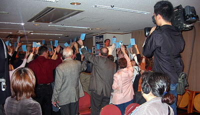 The rep for Wesley Clark, Sven Serrano, has stepped up and presented three quick video commercials, and made a very good presentation. As might be expected, everyone is wowed by Clark’s credentials. But with his low numbers in recent primaries and caucuses, there are probably a lot of people who would like to cote for him but won’t. (He later got 11 of the 140 votes cast.)