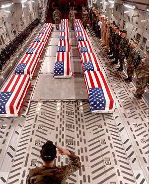 President Bush was “moved” by the photos of flag-draped coffins today. Yeah, right. That means that either this is the first time he was made aware that fallen American soldiers were being brought home, or he was lying so that he would look good politically. The latter, of course, is the correct answer–just as fake and dishonest as the administration’s claim that their policy of not releasing photos of the flag-draped coffins is to protect the privacy of the families. What a pathetic lie. Look at the photos. Can you identify any soldier, any family? Of course not. In refusing to attend the funeral of one American soldier, and in trying to hide the fact that these men and women of honor are returning home having made the ultimate sacrifice for their country, Bush is doing them the greatest dishonor. And he has the unmitigated gall to try to claim it’s all for the families’ sake.