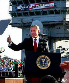 “And then there was the “Mission Accomplished” banner, which Bush later tried to blame the carrier’s sailors for, but later had to fess up was his own people’s work.”